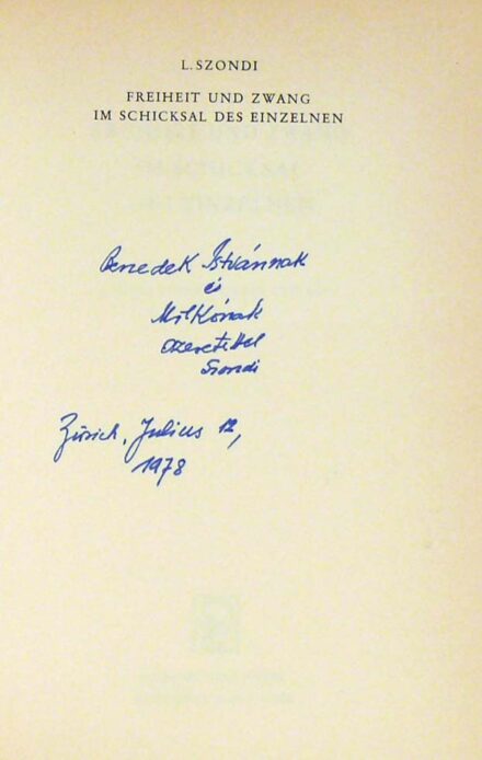 307. tétel:Szondi, L(ipót): Freiheit und Zwang im Schicksal des Einzelnen. Zweite, unveränderte Auflage. Benedek István ex librisszével. Benedek István (1915-1996) pszichiáternek és feleségének, Milkónak dedikált példány.