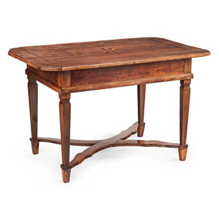 osztrák, 19. sz. második fele, fenyőfa alapon diófa, cseresznyefa és jávorfa borítással, intarziás díszítéssel, lecsavarható asztallappal, sérült