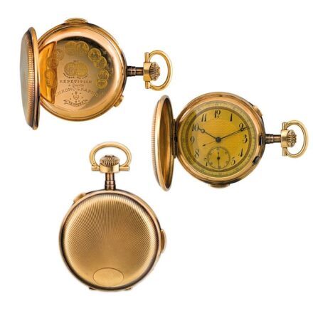 1900 körül, 1937 előtti behozatali jellel, 14 k arany tok és szerkezettakaró, sugárbordás díszítéssel, arab számos kis másodperckörös számlap, negyedütős, stopperes, chronograph szerkezet,