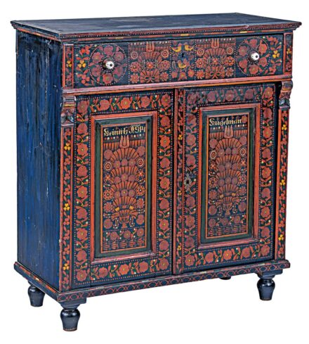 Kikiáltási ár: 95 000 FtFadd, 1883, festett fenyőfa, "Bajer Christl" és "Johan Schmal" feliratokkal, kovácsoltvas zárszerkezettel, fogantyúkkal és kulccsal, alul egy fiókkal, 95*122*63 cm