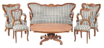 Kikiáltási ár: 240 000 Ftmagyar, 19. sz. második fele, fenyőfa alapon diófa borítással, jávorfa intarziával, kanapé: 99*198*75 cm, 2 db karszék: 97*70*94 cm, 2 db támlás szék: 99,5*48*46 cm, asztal: 53*138*91 cm