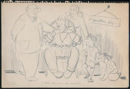 Jelzés nélkül: A gyanútlan férj (karikatúra). Ceruza, papír, 19,5x28,5 cm<a href="https://www.darabanth.com/hu/gyorsarveres/410/kategoriak~Festmenyek-es-grafikak/Festmenyek-es-grafikak-jelzessel-jelzes-nelkul~500002/Jelzes-nelkul-A-gyanutlan-ferj-ka