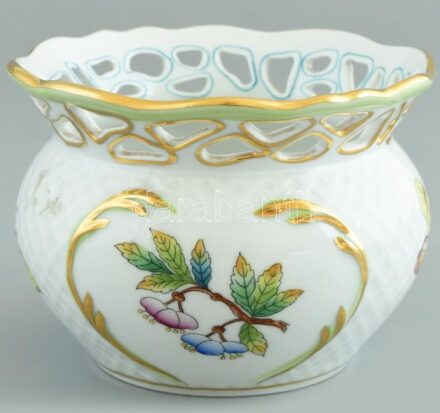 Herendi Viktória mintás áttört porcelán kaspó, kézzel festett, jelzett, kopásnyomokkal, m: 8,5 cm<a href="https://www.darabanth.com/hu/gyorsarveres/410/kategoriak~Porcelan-keramia-uveg/Porcelan~500006/Herendi-Viktoria-mintas-attort-porcelan-kaspo-ke