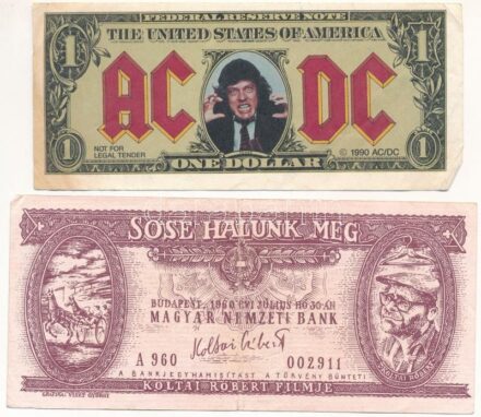 30054. tétel:~1990. 'Sose halunk meg' fantázia bankjegy Viszt György grafikájával, hátoldalán a film reklámja és támogatói + 1990. 'AC/DC' fantázia bankjegy T:III az egyiken kis szakadás, a másik hátulján tele firkával<a href="https://www.darabanth.com/hu/gyorsa