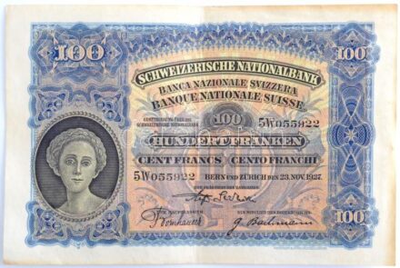 Svájc 1927. 100Fr T:III szép papír Switzerland 1927. 100 Franken C:F nice paper Krause 35.<a href="https://www.darabanth.com/hu/gyorsarveres/412/kategoriak~Numizmatika/Kulfoldi-bankjegyek~1500013/Svajc-1927-100Fr-TIII-szep-papir-Switzerland-1927-100