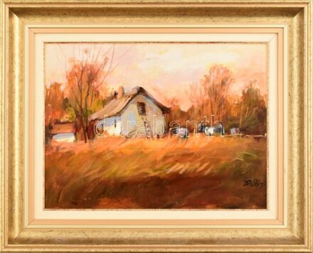 10011. tétel:B. Tóth Edit (1958-): Alföldi tanya állatokkal. Olaj, farost, jelzett. Dekoratív fa keretben, 30×40 cm<a href="https://www.darabanth.com/hu/gyorsarveres/413/kategoriak~Festmenyek-es-grafikak/Festmenyek-es-grafikak~500001/B-Toth-Edit-1958-Alfoldi-tan