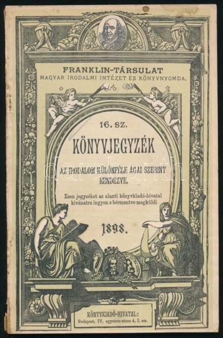 14450. tétel:1898 Franklin-Társulat 16. sz. könyvjegyzéke. Bp., Franklin-ny., 93+(3) p. Papírkötésben, kissé sérült, foltos.<a href="https://www.darabanth.com/hu/gyorsarveres/420/kategoriak~Mutargy-papirregiseg-egyeb/Nyomtatvanyok~1500002/1898-Franklin-Tarsulat-