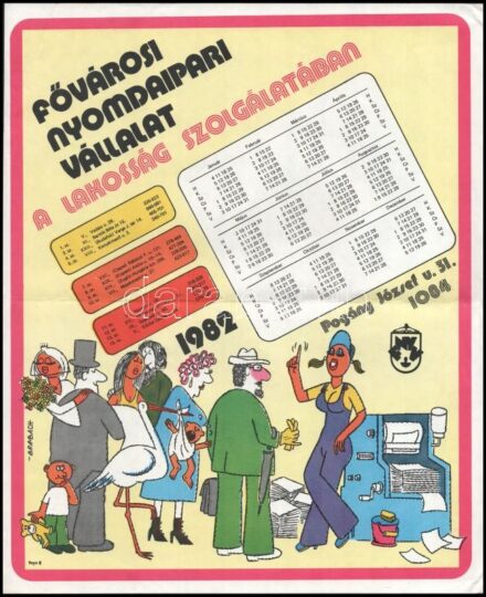 14440. tétel:1982 Fővárosi Nyomdaipari Vállalat a lakosság szolgálatában falinaptár, hajtott, gyűrődéssel, 36×29 cm<a href="https://www.darabanth.com/hu/gyorsarveres/420/kategoriak~Mutargy-papirregiseg-egyeb/Nyomtatvanyok~1500002/1982-Fovarosi-Nyomdaipari-Vallal