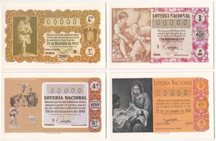 30084. tétel:Spanyolország 1981. Sorsjegyek képei modern képeslap reprodukciókon az 1897-1980 közötti időszakból (12xklf) T:I Spain 1981. Pictures of lottery tickets on modern postcards, images taken from the issues of the 1897-1980 time period (12xdiff) C:UNC<a