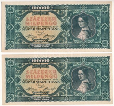 1946. 100.000MP (2x) sorszámkövetők 'B 056 045878 - B 056 045879' T:I,I- Adamo P30<a href="https://www.darabanth.com/hu/gyorsarveres/420/kategoriak~Numizmatika/Magyar-bankjegyek~2000007/1946-100000MP-2x-sorszamkovetok-B-056-045878-B-056-045879-TI-I