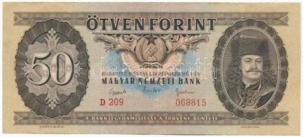 1951. 50Ft 'D 209 068815' T:III / Hungary 1951. 50 Forint 'D 209 068815' C:F Adamo F18<a href="https://www.darabanth.com/hu/gyorsarveres/420/kategoriak~Numizmatika/Magyar-bankjegyek~2000007/1951-50Ft-D-209-068815-TIII-Hungary-1951-50-Forint-D-209-06