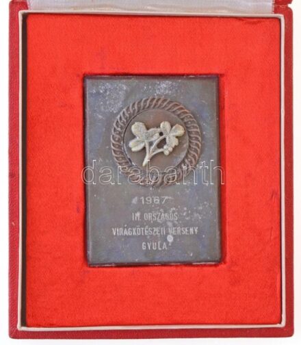 1967. 'III. Országos Virágkötészeti Verseny Gyula' fém plakett tokban (74,5x53,5mm) T:2 patina<a href="https://www.darabanth.com/hu/gyorsarveres/420/kategoriak~Numizmatika/Magyar-emlekveretek-plakettek~2000010/1967-III-Orszagos-Viragkoteszeti-Versen