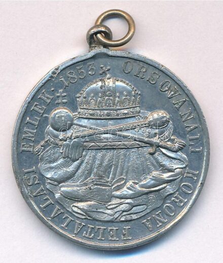 31295. tétel:1853. ‘Orsovánáli korona feltalálási emlék’ kétoldalas fém emlékérem füllel (28mm) T:2- ph, patina