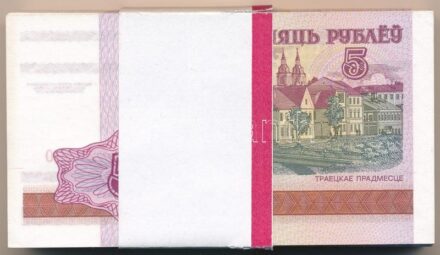 31974. tétel:Fehéroroszország 2000. 5R (100x) kötegelővel, sorszámkövetők T:I,I- Belarus 2000. 5 Rublei (100x) with wrapper, consecutive serials C:UNC,AU Krause P#22<a href="https://www.darabanth.com/hu/gyorsarveres/420/kategoriak~Numizmatika/Kulfoldi-bankjegyek