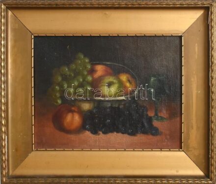 Jelzés nélkül: Gyümölcsös csendélet. Olaj, vászon, fa keretben, 20,5×27,5 cm<a href="https://www.darabanth.com/hu/gyorsarveres/424/kategoriak~Festmenyek-es-grafikak/Festmenyek-es-grafikak-jelzessel-jelzes-nelkul~500002/Jelzes-nelkul-Gyumolcsos-csend