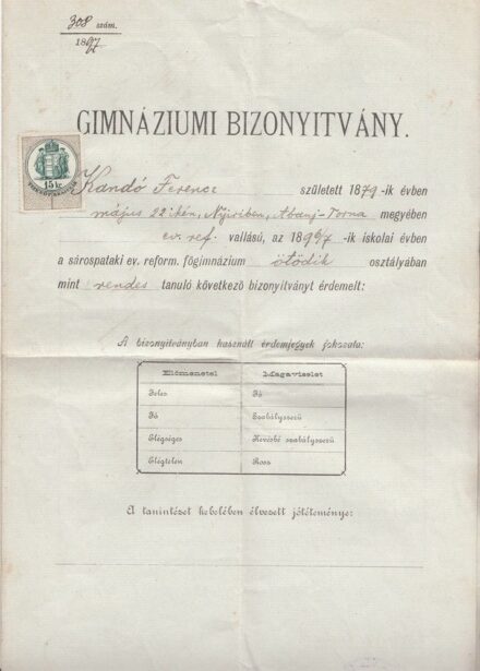 1897 Gimnáziumi bizonyitvány a sárospataki ref. főgimnázium pecsétjével