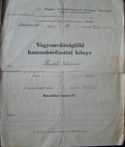 Kikiáltási ár: 800 Ft1927-28. Vagyonváltságföld haszonbérfizetési könyv Abádszalók