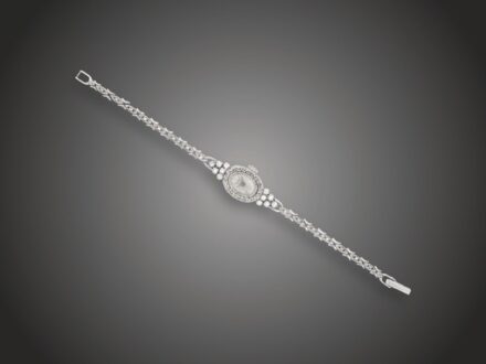 Kikiáltási ár: 200 000 FtNői koktél karóra Elgin Fehérarany 585, keskeny, patentzáras glides karpánton, oválisforma óratok, karláncon és óratokon 47 briliáns cca. 0,90 ct (M-ATCrSi) ékítéssel, 17 köves ankerjáratú működő szerkezet, jelzett USA, 1970 körül, tokszám: 04353-82138,