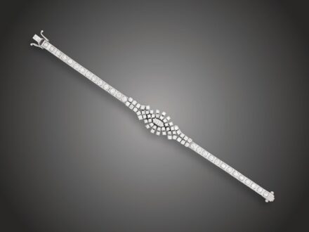 Kikiáltási ár: 320 000 FtKarkötő Fehérarany 750, keskeny karpánton care foglalt 27 briliáns, középen ékszertag 47 karmos foglalású briliáns összesen cca. 5,10 ct (MTCrVs), középen 1 navett csiszolású briliáns cca. 0,35 ct (MTCrVs) ékítéssel, nyelves zárral, 2 biztonsági nyolcass