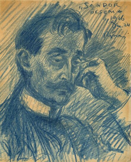 Kikiáltási ár: 24 000 000 FtCeruza, kréta, papír, 24,5 x 19,5 cm, Jelezve jobbra fent: "Sándor öcsém" 1916 dec. 24. Rónai
