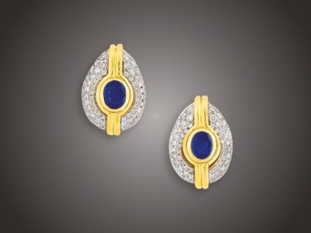 Kikiáltási ár: 650 000 FtFülbevaló pár Sárga- és fehérarany 750, csepp alakú fazon, ovális formájú, fazettált csiszolású 2 zafír cca. 2,20 ct, körülötte pave foglalt 132 briliáns cca. 1,70 ct (MTCrSi) ékítéssel, beszúrós stiftes szereléssel, 17,2 g