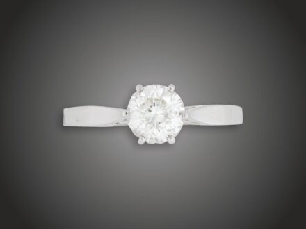 Kikiáltási ár: 250 000 FtSzoliter gyűrű_x000D_ Fehérarany 585, 1 nagyobb briliáns 1,13 ct ékítéssel, modern csiszolás, crystal színárnyalat, Si2 tisztaság, természetes zárványokkal, 3,0 g, átmérő: 17,7 mm