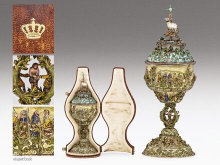 264. tétel:Húsvéti cibórium (ostyatartó) Arany, ezüst, festett zománc, barokk gyönggyel és karneollal díszítve, bruttó súly: 507 g. délnémet munka a 17.század első feléből, egykor a Habsburg család tulajdonában volt későbbi, aranyozott maroquin bőrből készült tokján