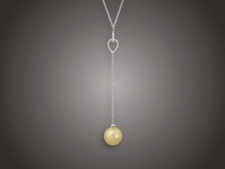 156. tétel:Nyaklánc függővel Fehérarany 750, vékony anker láncon csüngős függő, 1 aranysárga déltengeri tenyésztett gyöngy, szemátmérő: 13,4 mm, 38 apró briliáns cca. 0,20 ct (MCrSi) ékítéssel, 7,9 g, hossz: 38 cm, függő levehető