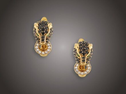 157. tétel:Fülbevaló pár Arany 750, plasztikus, ragadozó macska féle fej, pave foglalt 150 fekete briliáns cca. 3,00 ct és 18 színtelen briliáns cca. 0,40 ct (MCrSi) ékítéssel, beszúrós stiftes patentzárral, 13,2 g