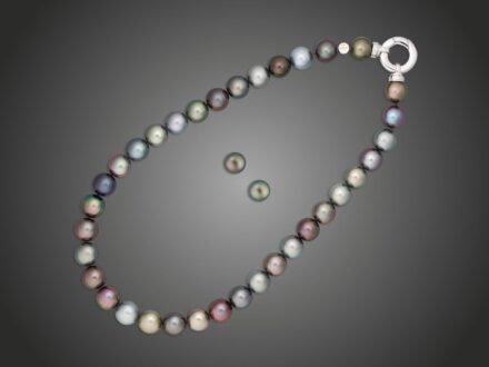Kikiáltási ár: 350 000 FtFehérarany 750, karika záron, különböző színárnyalatú, 35 tahiti gyöngyszem, szemátmérő: 11,4-12,0 mm, Schöffel márkajelzéssel, 83,4 g, hossz: 43 cm, fehérarany 585, fülbevaló pár 2 tahiti gyönggyel,