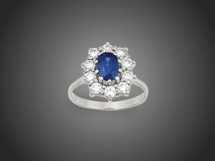 Kikiáltási ár: 250 000 FtFehérarany 585, karmos foglalatban 1 zafír cca. 1,00 ct_x000D_ és 10 briliáns cca. 0,80 ct (MTCrVs) karmazált fazonban,_x000D_ 3,7 g, méret: 54