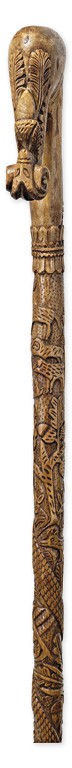 Kikiáltási ár: 18 000 FtNógrád megye, 20. sz. eleje, fémmel díszített bőr táska, faragott bot és ostornyél, ólom berakással díszítve, ostor: 240 cm, bot: 122 cm, táska: 20*30 cm,