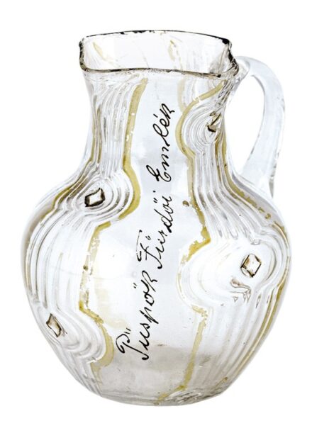 Kikiáltási ár: 26 000 FtErdély, 19. sz. második fele, színtelen hutaüveg, üvegszálas díszítéssel, "Püspök Fürdői Emlék" felirattal, m: 12,5 cm