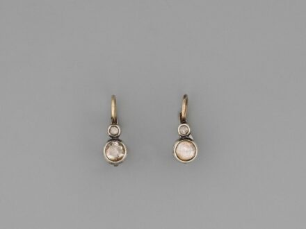 Kikiáltási ár: 60 000 FtFülbevaló pár Arany 580 és ezüst, zárt, buton foglalt 2 nagyobb és 2 apró rózsacsiszolású gyémánt cca. 0,40 ct ékítéssel, patentzáras beakasztással, 1930 körül, 2,0 g