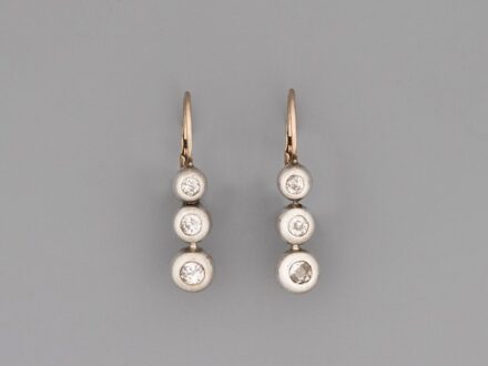Kikiáltási ár: 90 000 FtFülbevaló pár Arany 580 és ezüst, 6 buton foglalt régi csiszolású briliáns cca. 0,55 ct (R2CP2) ékítéssel, patentzáras beakasztással, 1930 körül, 5,2 g