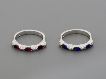 Kikiáltási ár: 85 000 FtGyűrű, 2 db Fehérarany 750, párban egyik zafír, másik rubin navett csiszolású kövekkel, 8-8 apró briliáns cca. 0,30 ct (MTCrSi) ékítéssel, 8,0 g, átmérő: 17,5 mm