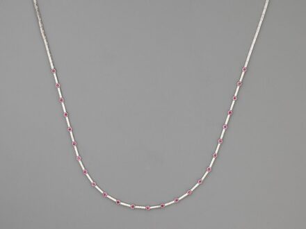 Kikiáltási ár: 90 000 FtNyakék Fehérarany 750, keskeny pánt, középrészén pálcika tagokon 120 apró briliáns cca. 0,80 ct (MCrSi) és 25 apró rubin ékítéssel, 12,1 g, hossz: 41 cm, rubinok kezeltek