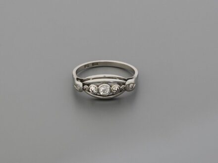 Kikiáltási ár: 180 000 FtNői gyűrű Fehérarany 585, áttört fej, sorban foglalt különböző nagyságú, régi csiszolású briliáns cca. 0,30 ct (R2CrP1) ékítéssel, 1930 körül, 2,8 g, átmérő: 17,7 mm