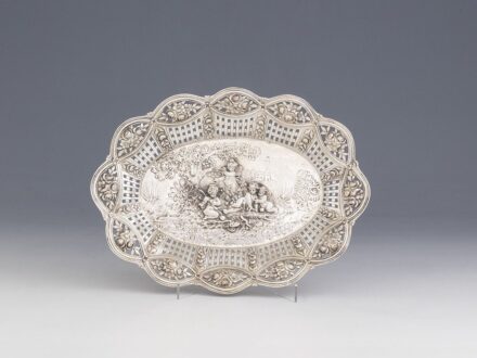 Kikiáltási ár: 18 000 FtNeorokokó dísztálka Ezüst 103 g. kerek forma, áttört peremszéllel, öblében játszadozó puttók ábrázolása. Jelzett: Hanau, 800-as fémfinomsági-, valamint 1937 utáni magyar behozatali jellel, Karl Söhnlein & Söhne. Német, XX. század eleje. Átm.: 13,5 cm