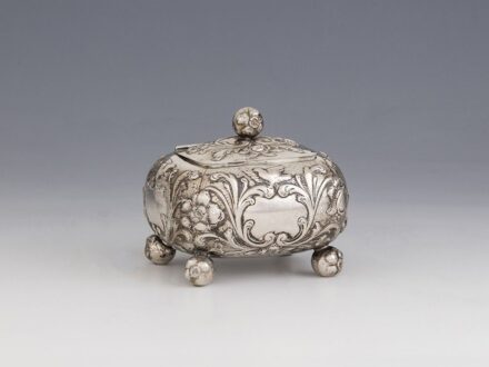 Kikiáltási ár: 38 000 FtNeorokokó cukordoboz Ezüst 283 g., belül aranyozva. Golyó lábakon álló öblös edény. Zsanéros fedelén plasztikus gránátalma fogóval. Jelzett: német, 800-as fémfinomsági-, valamint 1902 utáni pesti behozatali jellel. M.: 11,5 × 8,5 × 9 cm