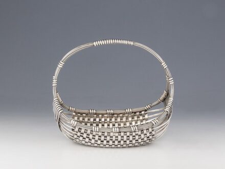 Kikiáltási ár: 60 000 FtJugendstil gyümölcskosár Ezüst, 757 g. Jelzett: Bécs, 1900 körül, Josef Carl Klinkosch császári és királyi udvari szállító. Neuwirth: I/301. M.: 23 × 13 × 20 cm