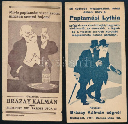 16265. tétel:cca 1910-1920 Paptamási Lythia gyógyforrásvíz 2 db számolócédula, főraktár. Brázay Kálmán, az egyiken kis szakadással, a másikon hajtásnyommal.