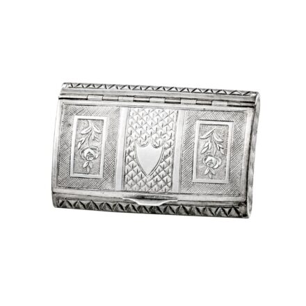 Kikiáltási ár: 90 000 Ft19. sz. közepe, antik ezüst, "WM" mesterjegy, vésett, poncolt díszében, rózsaszálakkal és üres monogrampajzzsal, íves dobozka, zsanéros nyitódással, 88, 2 g; 7, 2*4, 8*1, 6 cm