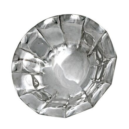 Kikiáltási ár: 85 000 FtPest, 1867-1936 közötti fémjel, 800 ezrelékes ezüst, Taub Jenő mesterjegy, trébelt, mély öblű, 12 cikkelyből alakított forma, 348 g; 6* 23 cm