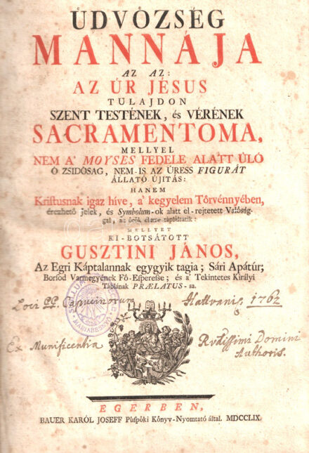 19607. tétel:Nagy [Ferenc] Ferentz: Az egy, igaz, és boldogító hitnek elei. Mellyeket fö tisztelendö, és nagy méltóságú galántai gróf Eszterházy Károlynak [. . . l Egri püspöknek [. . .] Kegyelmes Parantsolattyából egybe szedegetett és ki-nyomtattatott Nagy Ferentz. Egerben, 1767. Nyomtattatott a' Püspöki Oskola Betöivel. [52] + 368 + [10] p. Első kiadás. Nagy Ferenc törökszentmiklósi római katolikus plébános ízes magyar nyelven írt hitvédelmi irata a katolikus egyház teológiai és erkölcstani oktatását kivonatolja szentírási források és katolikus egyházi írók munkássága nyomán. A magyar nyelvű hitvédelmi írás elé kötve az Egri Teológiai Akadémia professzorainak "Positiones selectae Ex Universa Theologia, S. Scriptura, & SS. Canonibus" című, 38 számozatlan oldal terjedelmű teológiai disszertációja. Oldalszámozáson belül fametszetű könyvdíszekkel. Az első előzéken a latin nyelvű teológiai disszertáció egyik szerzőjének, Pál András egri teológiai professzornak saját kezű tulajdonosi bejegyzése, a címlapon régi gyűjteményi bejegyzés, verzóján régi tulajdonosi bélyegzés. Négy bordára fűzött, díszesen aranyozott gerincű korabeli bőrkötésben, vörös festésű lapszélekkel. Dekoratív, szép példány.