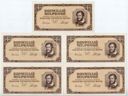 30525. tétel:1946. 1.000.000MP (5x) + 100.000.000MP (5x) T: 6db I- sarokhajlásokkal és a széleken kisebb hajlásokkal, 1db II, 1db III szép papírral Adamo P31, P33<a href="https://www.darabanth.com/hu/gyorsarveres/414/kategoriak~Numizmatika/Magyar-bankjegyek~2000