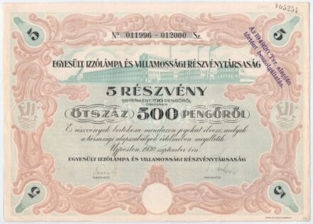 30061. tétel:Újpest 1930. 'Egyesült Izzólámpa és Villamossági Részvénytársaság' részvénye 500P-ről, szárazpecséttel, bélyegzéssel T:I-,II széleken kis szakadások<a href="https://www.darabanth.com/hu/gyorsarveres/414/kategoriak~Numizmatika/Reszvenyek-es-sorsjegye