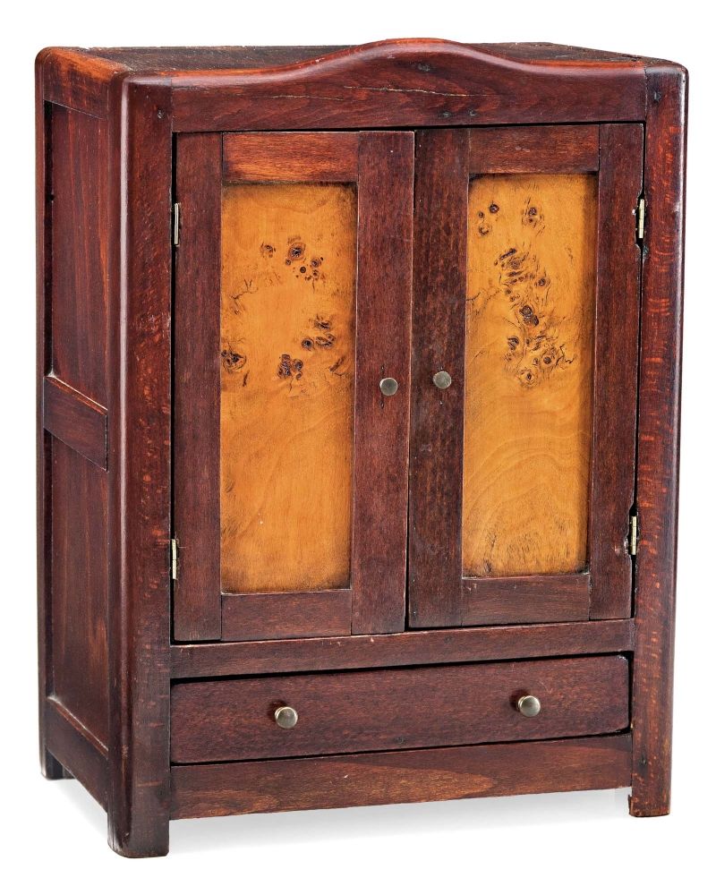 Kikiáltási ár: 220 000 Ftmagyar, 19. sz. vége, fenyőfa alapon diófa borítással, fiókokon feliratokkal, hiányos 15*30*19 cm