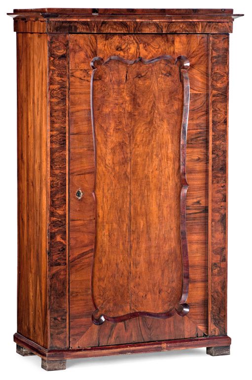 Kikiáltási ár: 95 000 Ftmagyar, 19. sz. vége, fenyőfa alapon diófa borítással, fiókokon feliratokkal, hiányos 15*30*19 cm
