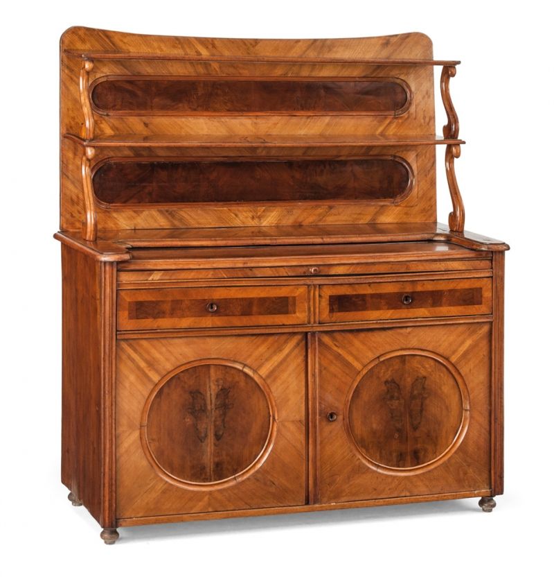 Kikiáltási ár: 95 000 Ftmagyar, 20. sz. első fele, fenyőfa alapon diófa borítással, sérült 164*119*48,5 cm